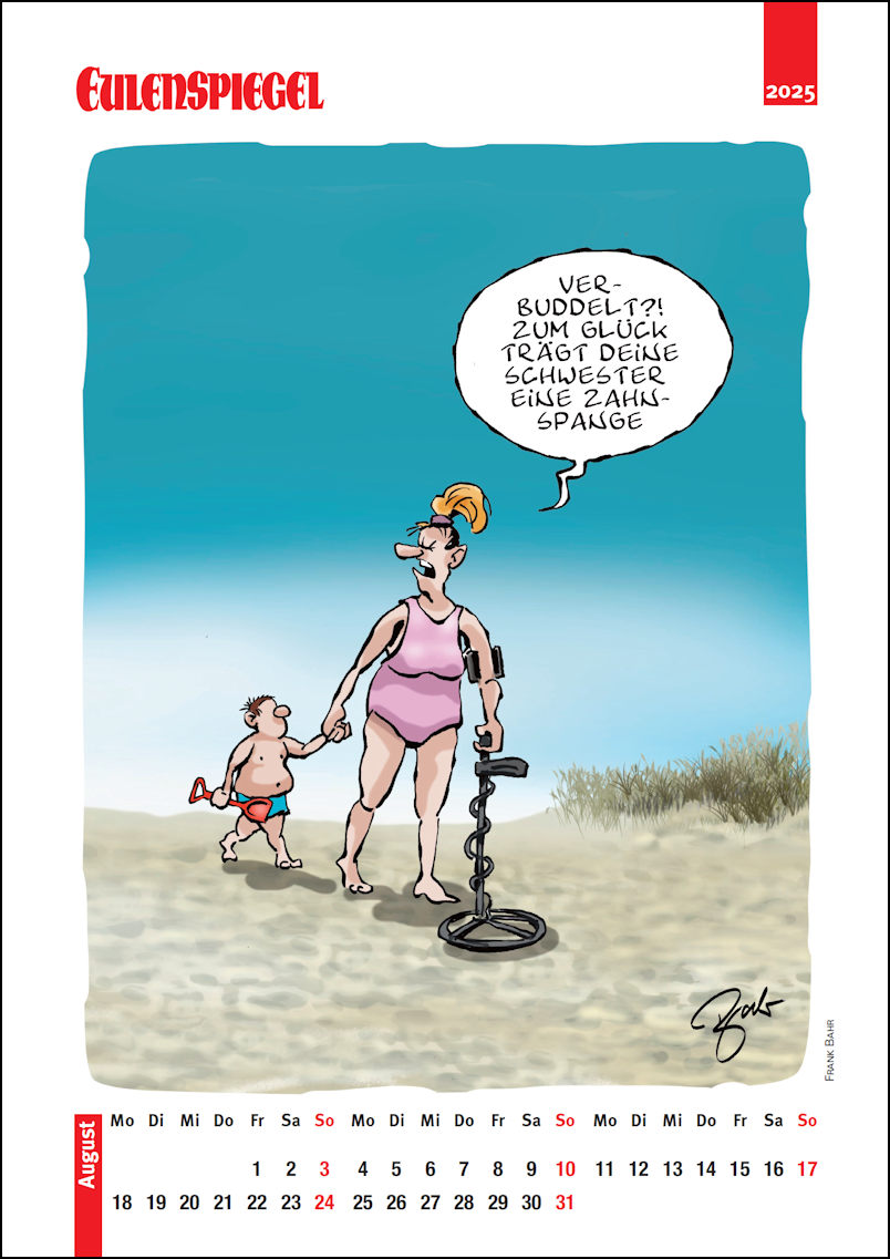 Kalenderblatt August 25 22. August 2025 0 min read Aus dem EULENSPIEGEL Cartoon-Kalender 2025Cartoon von FRANK BAHRDer neue EULENSPIEGEL Cartoon-Kalender 2026 ist da! Wandkalender bestellen Anzeige Witzige Cartoons und bissige Satire per Newsletter Melden Sie sich jetzt kostenlos an: Vorname oder ganzer Name E-Mail Cartoon der Woche (Montag) EULENSPIEGEL Newsletter (Dienstag und Donnerstag) EULENSPIEGEL-Laden (Mittwoch) Rätsel- und Gewinnspiel Newsletter (Freitag) Indem Sie fortfahren, akzeptieren Sie unsere Datenschutzerklärung.