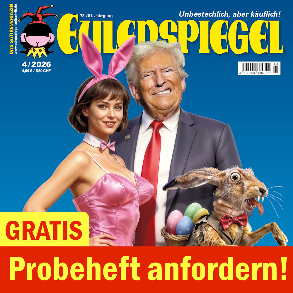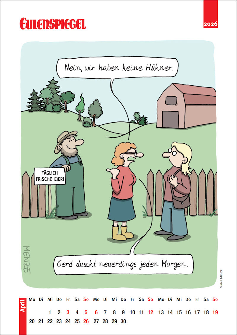 Kalenderblatt April 26 17. April 2026 0 min read Aus dem EULENSPIEGEL Cartoon-Kalender 2026 Cartoon von Nadia Menze Anzeige Witzige Cartoons und bissige Satire per Newsletter Melden Sie sich jetzt kostenlos an: Vorname oder ganzer Name E-Mail Cartoon der Woche (Montag) EULENSPIEGEL Newsletter (Dienstag und Donnerstag) EULENSPIEGEL-Laden (Mittwoch) Rätsel- und Gewinnspiel Newsletter (Freitag) Indem Sie fortfahren, akzeptieren Sie unsere Datenschutzerklärung.