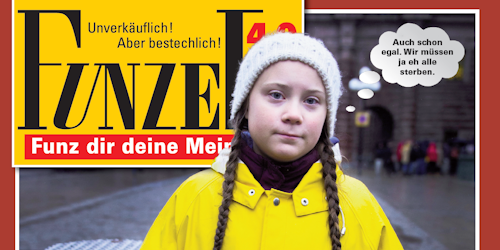 weiterWir waren erstaunt, welcher Zorn einem kleinen schwedischem Schulmädchen entgegenschlägt, das sich für Klimaschutzbelange einsetzt. Der EULENSPIEGEL möchte gern aus dieser Wut Profit schlagen. Darum erscheint unsere neue Ausgabe auf Papier, das aus illegal gerodeten Bäumen der letzten intakten brasilianischen Urwälder gewonnen wurde. Die Redaktion hat sich zudem verpflichtet, in der Mittagspause nur noch Einweggeschirr zu benutzen. Alle Beiträge wurden so geschrieben, dass beim Lesen besonders viel CO2 ausgeschüttet wird. Besonders die Artikel über gelebten Einbruchschutz (Seite 14), Heidi Klum (Seite 20) und unsere Reportage über die wunderbaren Zustände in deutschen Asylantenheimen (Seite 22) sind echte Klimakiller! Kaufen Sie also schnell das Heft, damit Sie es Greta und dieser verfluchten Erde endlich heimzahlen können!