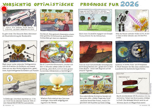 ab einem gewissen Alter lohnt sich eine neue Hüfte oder das Rezept für eine große Packung Ibuprofen 600 nicht mehr. Doch so hochbetagt, dass sich die Lektüre des neuen EULENSPIEGEL nicht lohnen würde, kann man gar nicht werden! Im aktuellen Heft erfahren Sie u.a. alles über die verwegenen Rentenrebellen der CDU (Seite 22). Außerdem gibt es eine vorsichtig optimistische Prognose für das Jahr 2026 (Seite 32) und Neuigkeiten zum Verbleib der Münchener Eisbachwelle (Seite 49).